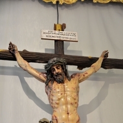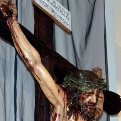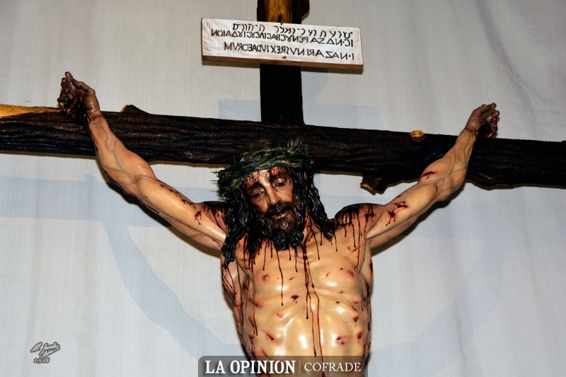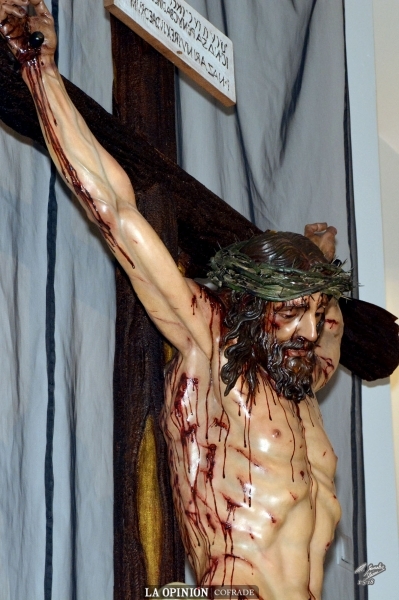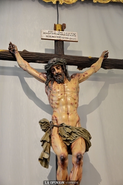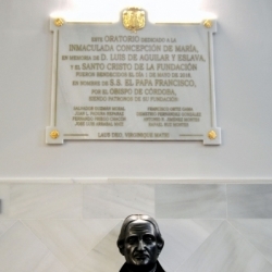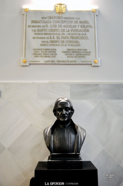 El Santo Cristo de la Fundación, extraordinaria imagen realizada por el profesor Miñarro y que había sido traído desde Sevilla en la tarde - noche del sábado 28 de abril, se encontraba en el lugar donde quedará ubicado, sobre un calvario de iris morados con un paño grisáceo que enmarcaba la soberbia talla representando simbólicamente el velo del templo - aún sin rasgar por ser un Cristo vivo -. Frente al Santo Cristo, una escultura en bronce del fundador Luis de Aguilar y Eslava y sobre él uno de los escudos más antiguos de la Fundación que ha sido restaurado para la ocasión y una lápida en mármol como recordatorio del evento. No faltaban tampoco las cruces de las catorce estaciones del Vía Crucis, en madera con la cruz de Jerusalen que se distribuyen por las paredes del oratorio terminando en la imagen del imponente Crucificado de Miñarro.