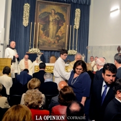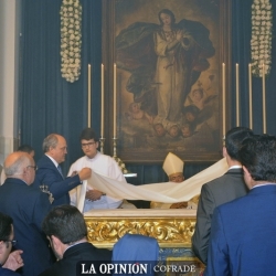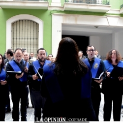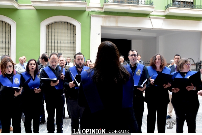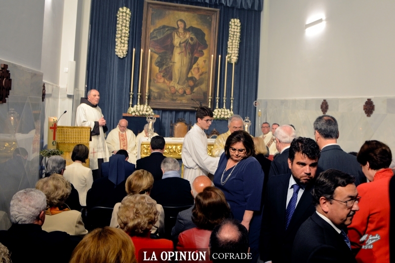 Cuando llegaba el cortejo al final de la calle Pepita Jiménez y con el eco de las campanas del Ángelus de la cercana iglesia de la Soledad - parroquia de los Remedios -, el Coro de Cámara de la Fundación Aguilar y Eslava entonaba el Himno del Año de la Misericordia, acompañado al órgano por Rafael Sabariego y bajo la dirección de Mª José Villatoro. Una vez en el interior se iniciaba el rito que comenzó por la aspersión con agua bendita de los muros del nuevo oratorio y de la imagen del Santo Cristo, tras la monición que realizó el presidente de la Fundación, Salvador Guzmán Moral indicando algunos aspectos de la historia del Oratorio de la Purísima y de la recuperación del mismo en esta jornada histórica.