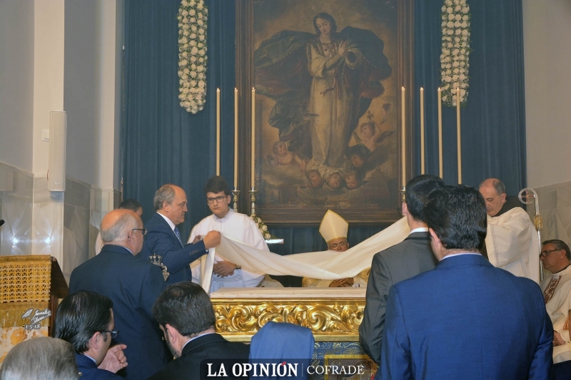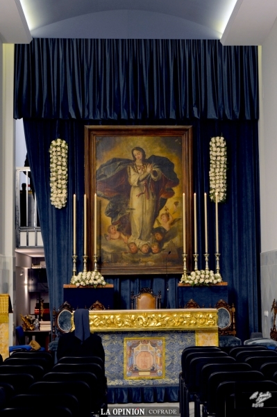 En el altar mayor presidía un viejo lienzo de la Purísima que, según los inventarios del archivo histórico de la Fundación, presidiría el primer oratorio del antiguo Real Colegio a finales del siglo XVII. Dos grecas y sendos centros de rosas blancas con flor de cera junto a los siete candelabros que, por presidir el obispo, podían verse en el altar así como un centro de rosas rojas y cardos para la mesa adornaban de manera preciosa este sencillo recinto. Según indicó el presidente de la Fundación, el altar y otros elementos en madera con pan de oro, ha sido cedido por el Ayuntamiento de Cabra procedente de la capilla privada de la Vizcondesa de Termens y que han sido adaptados para la celebración. Un paño con el rostro de la Sábana Santa, a modo de mandilión se ubicó en el frontal del altar que, hasta ser bendecido, se encontraba sin revestir.