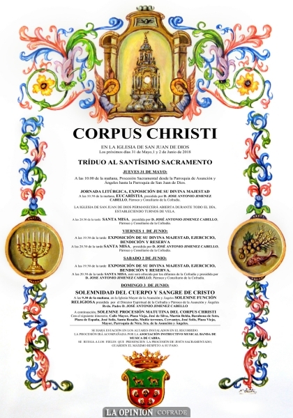 Con la celebración del Jueves del Corpus, la cofradía del Santísimo Sacramento de nuestra ciudad, inicia los cultos en honor de Jesús Sacramentado en la mañana del jueves 31 de mayo, fecha en que se celebraba el Jueves del Corpus.