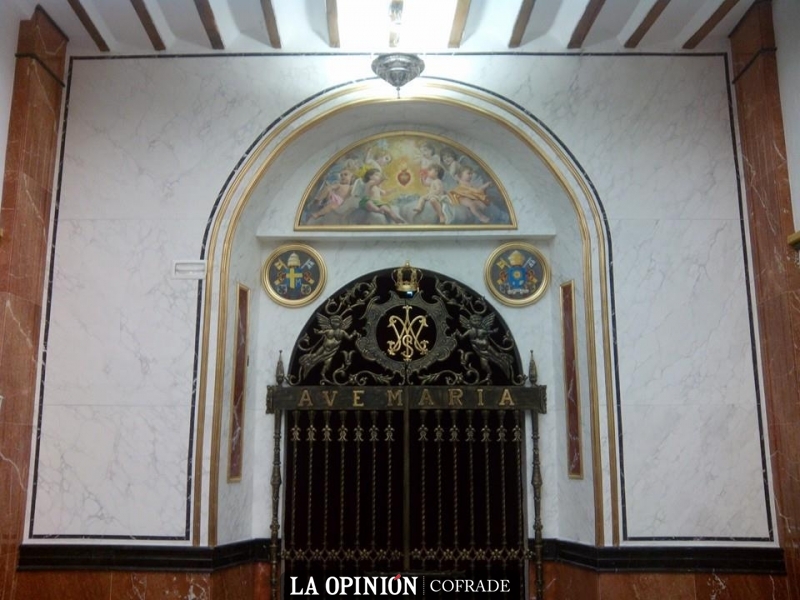 A los lados de la puerta se van a situar dos cartelas circulares con los escudos de los pontificados de san Juan Pablo II (Coronación) y el Papa Francisco (Año Jubilar).
