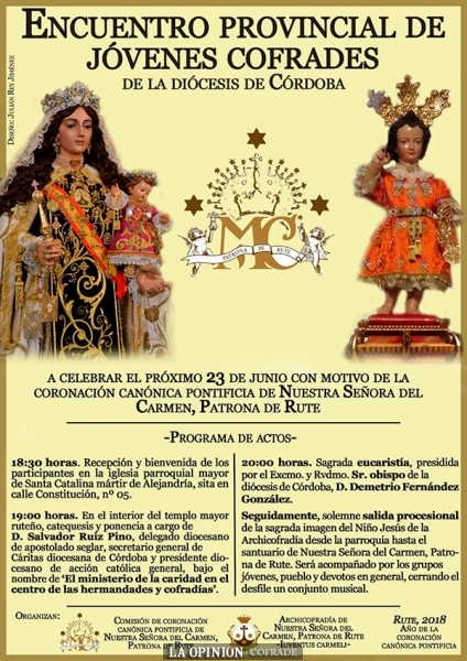 El encuentro comenzará a las 18:30 con la recepción de los asistentes en la iglesia parroquial mayor de Santa Catalina mártir de Alejandría donde Salvador Ruiz, delegado diocesano de apostolado seglar, realizará la ponencia "El ministerio de la caridad en el centro de las hermandades y cofradías". A las 20:00 horas se celebrará la eucaristía presidida por el obispo de Córdoba, don Demetrio Fernández, en la que estará presente el coro parroquial Santa Catalina Mártir. Al término de la misa, comenzará la procesión del Niño Jesús de la Archicofradía de Nuestra Señora del Carmen hacia el santuario de la Patrona de Rute. La jornada concluirá con el rezo de la salve ante la Virgen.