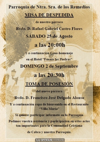 Paralelamente la toma de posesión del nuevo párroco de los Remedios será el día 2 de septiembre a las 20:30h. que servirá para dar la bienvenida a Cabra al sacerdote Francisco José Delgado Alonso.