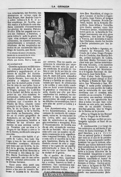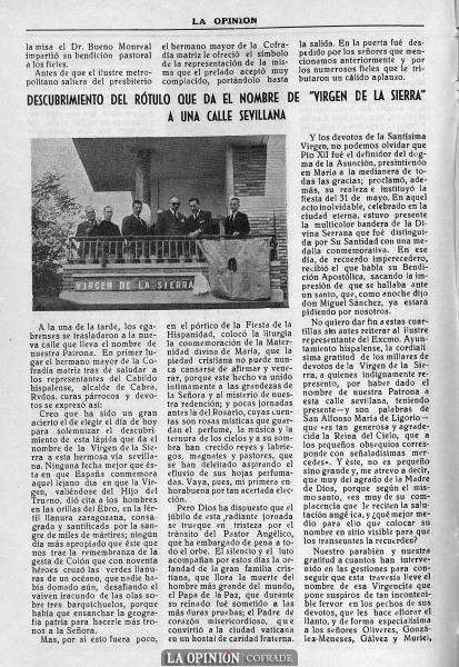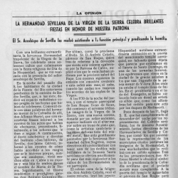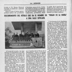 En el año 1958, el 12 de octubre, gracias a la iniciativa de la hermandad filial, se dedicó una calle con el nombre de "Virgen de la Sierra" en Sevilla. Además presidió la función el Cardenal arzobispo de Sevilla Bueno Monreal. La crónica que recogío de los actos, cultos y pregón de hace 60 años, detallan junto con fotografías de Ángel Calvo, todo lo que aconteció entre el 8 y el 12 de octubre de 1958.