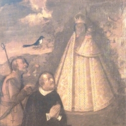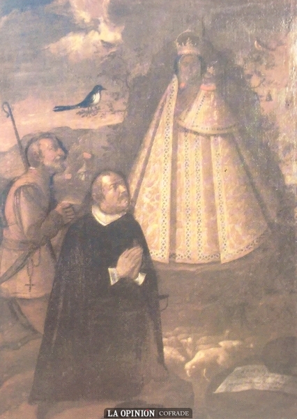 Si la figura del pastor es uno de estos elementos, siempre presente y asidua en cuadros de otras advocaciones donde la leyenda de la aparición es similar, en esta ocasión aparece un nuevo personaje que destaca por situación y color. Sin duda quien encargó la pintura se hizo retratar sobriamente vestido, con espada al cinto, demostrando así ser persona principal y en actitud de orar.