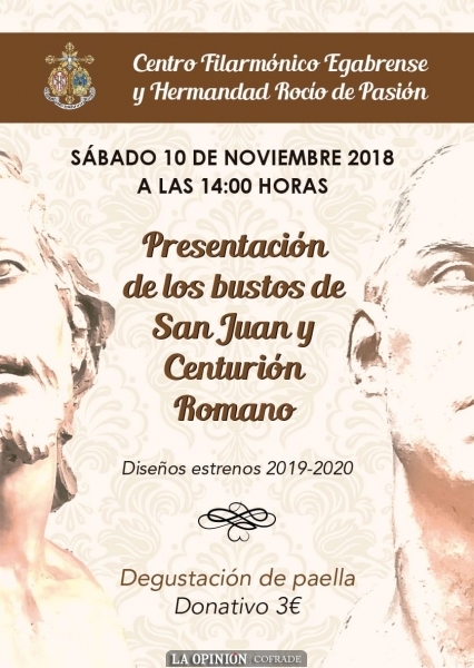 El acto tendrá lugar en el Centro Filarmónico Egabrense a partir de las 14:00h del sábado y contará con la presencia del autor de las imágenes, el escultor lucentino F. Javier López del Espino. En la presentación podrán verse los bustos de las imágenes de San Juan y el Centurión Romano que se incorporarán al grupo escultórico del misterio del Sagrado Encuentro en la próxima Semana Santa de 2019.