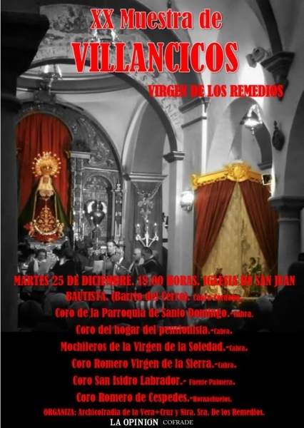 La Archicofradía de la Santa Vera Cruz organiza el próximo 25 de diciembre, a partir de las 18:00 horas, en su sede canónica -la Iglesia-Santuario de San Juan Bautista y María Santísima de los Remedios- la XX edición de la Muestra de Villancicos Populares "Virgen de los Remedios".
