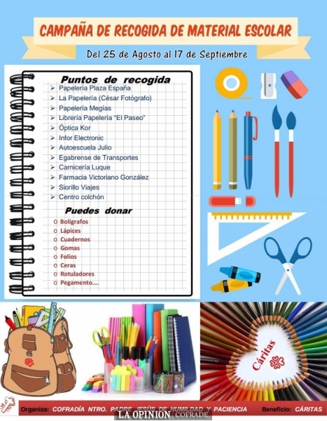 La cofradía de Humildad y Paciencia, organiza una campaña solidaria de recogida de material escolar que comenzó hace unas semanas. Hasta el 17 de septiembre, en los establecimientos colaboradores con la campaña se puede hacer la entrega en el horario comercial.