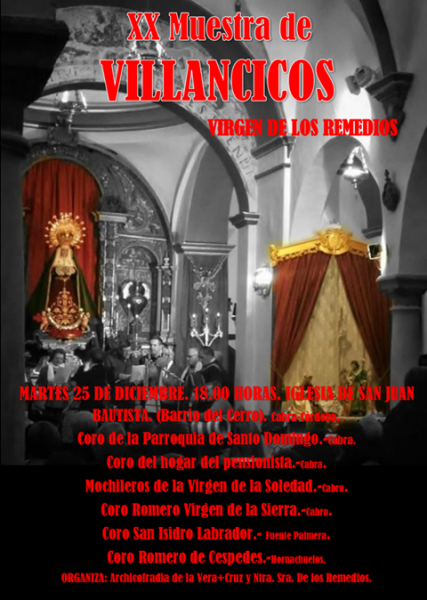 Esta XX Muestra de villancicos populares "Virgen de los Remedios" tendrá lugar la tarde de Navidad, el martes 25 de diciembre, a partir de las 18:00h y contará con la participación de los siguientes coros: