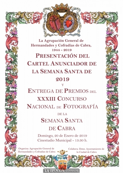 El acto tendrá lugar en el Cinestudio Municipal a las 13:30h y sirve para presentar el cartel oficial de la Semana Santa que será llevado a FITUR. También se hará entrega de los premios del XXXIII concurso convocado al efecto en el que se eligió el cartel, la portada del programa de horarios e itinerarios y el resto de premios.