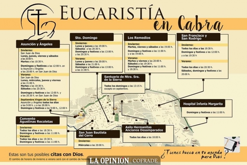 Se ha dado a conocer un cuadro horario con las misas que tienen lugar en Cabra durante todo el año. Los horarios se adaptan al cambio de horario oficial, de manera que el próximo sábado comenzarán a regir los horarios de invierno.