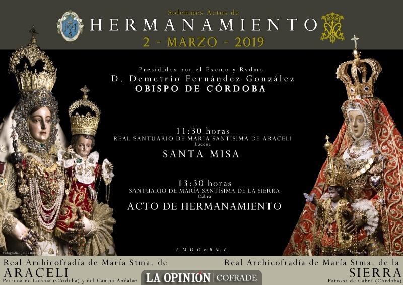 Se celebrarán dos actos en cada uno de los respectivos santuarios de Lucena y Cabra, asistiendo el obispo de Córdoba, monseñor Fernández, así como representantes de ambas archicofradías, clero y otras representaciones de las dos localidades de la Subbética.