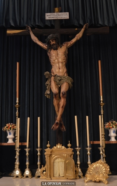 La cruz arbórea, concebida como un verdadero árbol de la vida, ha sido tallada por el tallista sevillano Enrique lobo y el títulus crucis, sigue el modelo de la reliquia de la basílica de la Santa Cruz de Roma escrita en arameo, griego y latín, con la particularidad de que aparecen inscritas de derecha a izquierda.