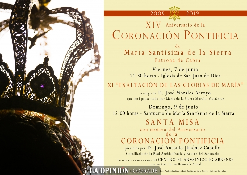 Los actos de este XIV aniversario serán la exaltación de las Glorias de María, que estará a cargo del hermano mayor de San Rodrigo, el costalero José Morales Arroyo en la iglesia de San Juan de Dios, el viernes 7 de junio a las 21:30h. Y el domingo en el Santuario, a las 12:00h será la celebración religiosa que, junto a la Romería del Centro Filarmónico Egabrense, será presidida por el rector y párroco de la Asunción, José Antonio Jiménez Cabello.
