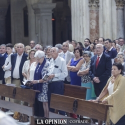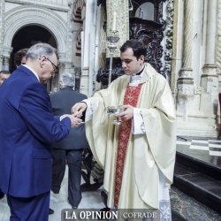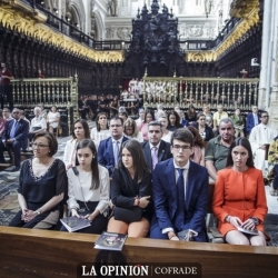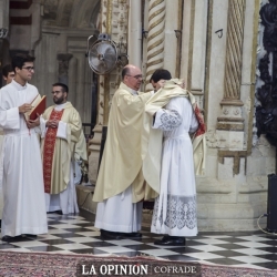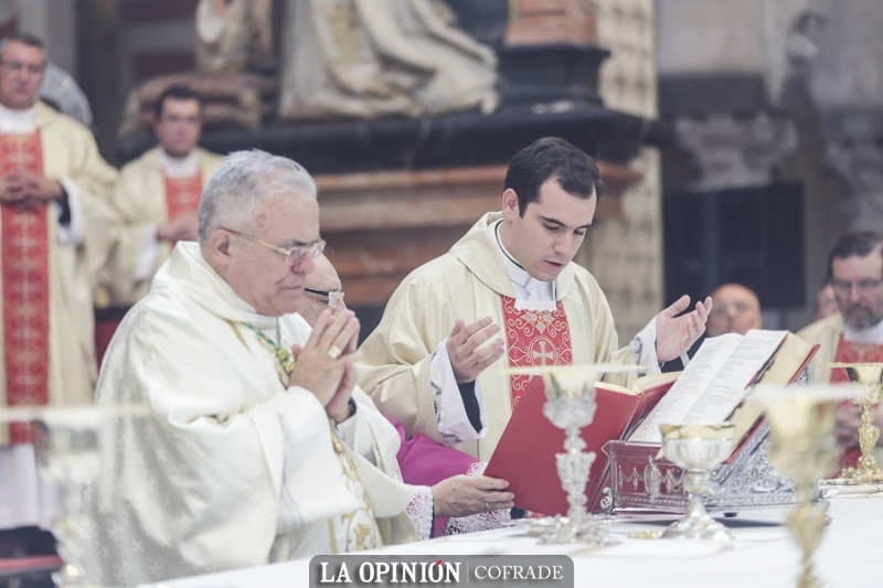 Al inicio de la celebración, que ha contado en la parte musical con la orquesta y coro de la catedral y el seminario y al órgano Manuel Calahorro, sonó en el órgano la melodía del Himno a la Bandera, lo mismo que al final, durante el besamano a los nuevos sacerdotes, las coplas de la Virgen de la Sierra.