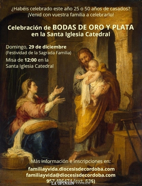 Aquellos matrimonios que quieran participar en esta celebración deben inscribirse antes del 23 de diciembre en el correo electrónico delegacionfamiliayvida@diocesisdecordoba.com, o bien a través del teléfono 957 496 474 -extensión 636-.