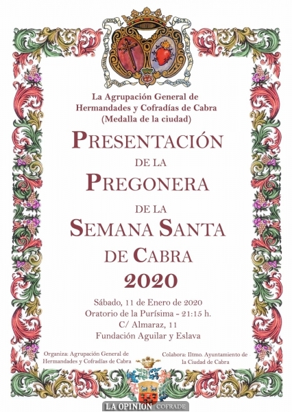 El próximo sábado 11 de enero de 2020, a las 21:15h, la Agrupación General de Hermandades y Cofradías de nuestra ciudad, con la colaboración del Ayuntamiento de Cabra y la Fundación Aguilar y Eslava, ha organizado la presentación de la pregonera de la Semana Santa para este año.