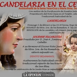 También la fiesta de la Candelaria supone la celebración del triduo de la Real Hermandad y Cofradía del Calvario y Nuestra Señora del Rosario, coincidiendo con el aniversario de la imagen que tallara Salvador Guzmán Moral, y que se celebra en la parroquia de los Remedios (Iglesia de la Soledad) los días 31 de enero, 1 y 2 de febrero, a las 18;30 de la tarde, con el siguiente orden de cultos: EXPOSICIÓN, RESERVA DE SU DIVINA MAJESTAD, SANTO ROSARIO Y SANTA MISA que preside el párroco y consiliario Francisco José Delgado Alonso. El día 2 los cánticos estarán a cargo del Centro Filarmónico Egabrense. Al terminar la Santa Misa del día 2, bendición e imposición de medallas a los nuevos hermanos/as, a continuación solemne besamanos a la imagen de Ntra. Sra. del Rosario, Madre de la Iglesia.