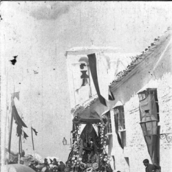 La procesión se inicia a las 9,50 de la mañana del día 1º de agosto de 1916. Llevaba la cruz el cronista del relato y director de La Opinión, don Manuel Mora y Aguilar; los ciriales, el maestro que hizo la campana, Vicente Rosas Soler y don Juan Domínguez; sal, llevada por la señorita Anita Caravaca y Periquito Salido; acetre la señorita María Luisa Gómez, presidenta del ropero; incensario, Juan García; bandejas con flores doña Josefa Caballero de Leña, doña Manolita Lama de Gómez, doña María de la Sierra Gómez de Cañero y la señorita María Luisa Leña Caballero; dos largas filas de devotos forman la procesión, que preside, de capa, el arcipreste don Andrés Caravaca, a quien acompaña "nuestro distinguido compañero don Joaquín Cañero que lleva libros, salmos y rituales de la bendición". El gentío es inmenso formándose en el Picacho una procesión "hermosísima con las señoras, señoritas y caballeros que están en la ermita y los que fueron de Cabra".