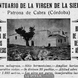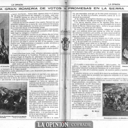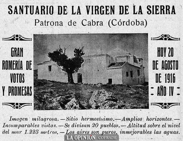 De nuevo, el extraordinario de septiembre de 1916, recoge con detalle una crónica de la Romería de Votos y Promesas de aquel año. Con fotografías de Venancio y Rafael Ruiz, como la que reproducimos de la procesión alrededor del santuario y que se publicaron en La Opinión hace 100 años, mostrando el fervor reinante en aquella romería que sustituyó a la del día 8 de septiembre cuando la fiesta de la Natividad se comenzó a celebrar en Cabra y no en la Sierra. Una romería que también servía para conmemorar la aparición de la imagen en la Cueva y la importancia de que la Virgen estuviera siempre en el Santuario, menos en las fiestas de Septiembre en que sería bajada a la ciudad para celebrar el 8 de septiembre y el mes de estancia en la parroquia.