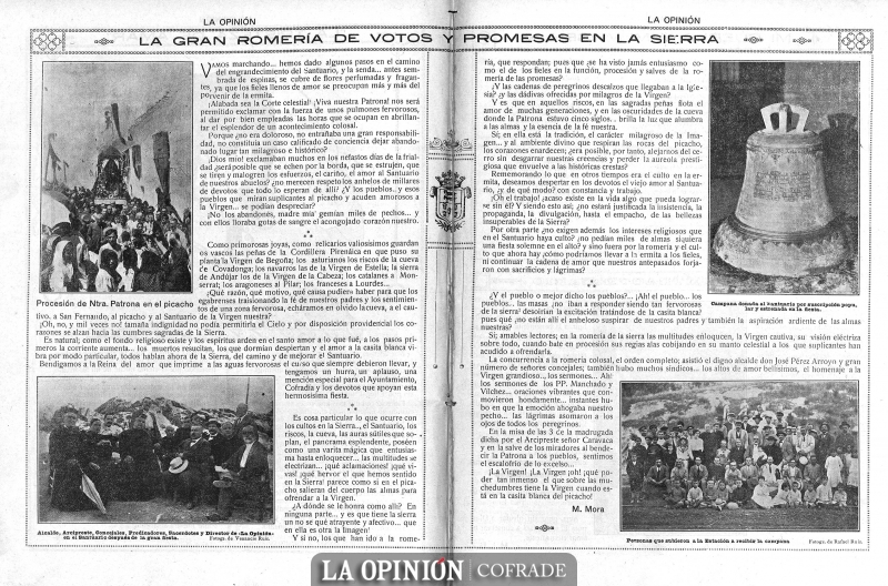 En estos días en que tiene lugar la 103ª Romería de Votos y Promesas, cuando se cumplen también 100 años de aquella campana popular y de la elección de don Manuel Mora y Aguilar como hermano mayor de la Real Archicofradía, terminamos con uno más de los párrafos que escribió en aquellos años de La Opinión como motor indiscutible de la difusión y engrandecimiento del Santuario y de la devoción a la Divina Serrana: