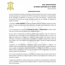 La Junta de Gobierno de la Real Archicofradía de María Santísima de la Sierra, en base a la grave situación generada por la pandemia del COVID-19, siguiendo las indicaciones y recomendaciones de las autoridades competentes, en acuerdo con el rector del Santuario, y buscando evitar concentración de personas que puedan provocar el avance de los contagios, ha adoptado las siguientes medidas: