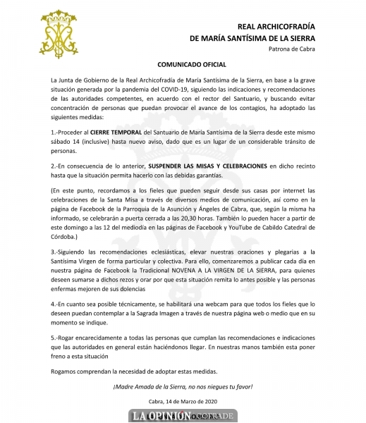 1.-Proceder al CIERRE TEMPORAL del Santuario de María Santísima de la Sierra desde este mismo sábado 14 (inclusive) hasta nuevo aviso, dado que es un lugar de un considerable tránsito de personas.