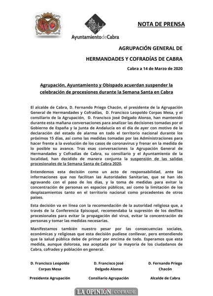 Este es el texto del comunicado que han emitido conjuntamente Agrupación, Obispado y Ayuntamiento por el que acuerdan suspender la celebración de procesiones durante la Semana Santa en Cabra: