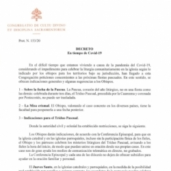 Por último, la tercera indicación que aparece en el mencionado Decreto del Vaticano se refiere al Triduo Pascual, explicando que "los obispos darán indicaciones, de acuerdo con la Conferencia Episcopal, para que en la iglesia catedral y en las iglesias parroquiales, incluso sin la participación física de los fieles, el obispo y los párrocos celebren los misterios litúrgicos del Triduo Pascual, avisando a los fieles la hora del inicio, de modo que puedan unirse en oración desde sus propias casas".