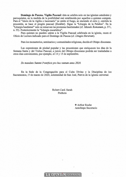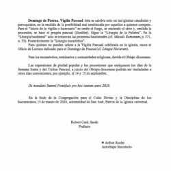 En cuanto al Domingo de Pascua, el Decreto indica que la Vigilia Pascual "se celebra solo en las iglesias catedrales y parroquiales, en la medida de la posibilidad real establecida por aquellos a quienes compete", y para el "inicio de la vigilia o lucernario se omite el fuego, se enciende el cirio y, omitida la procesión, se hace el pregón pascual (Exsúltet). Sigue la "Liturgia de la Palabra" y en la "Liturgia bautismal" solo se renuevan las promesas bautismales: posteriormente, la "Liturgia eucarística"".