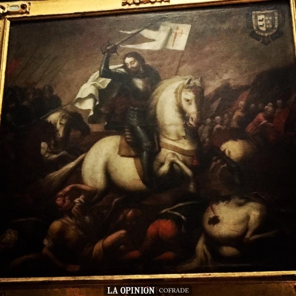 Ilustración: De las diferentes representaciones del Apóstol Santiago en nuestra ciudad hoy destacamos el gran lienzo sobre la Batalla de Clavijo que alberga la capilla del Sagrario de la parroquia de la Asunción y Ángeles. Fechado en el primer cuarto del siglo XVIII se halla timbrado en el superior derecho por las armas de la casa de Cabrera, respondiendo al modelo iconográfico del "matamoros" que alude al fundador de la capilla, Francisco de Cabrera, caballero que fue de la Orden de Santiago. SchCE