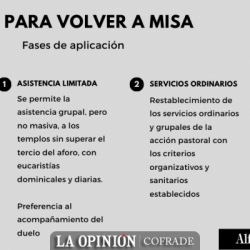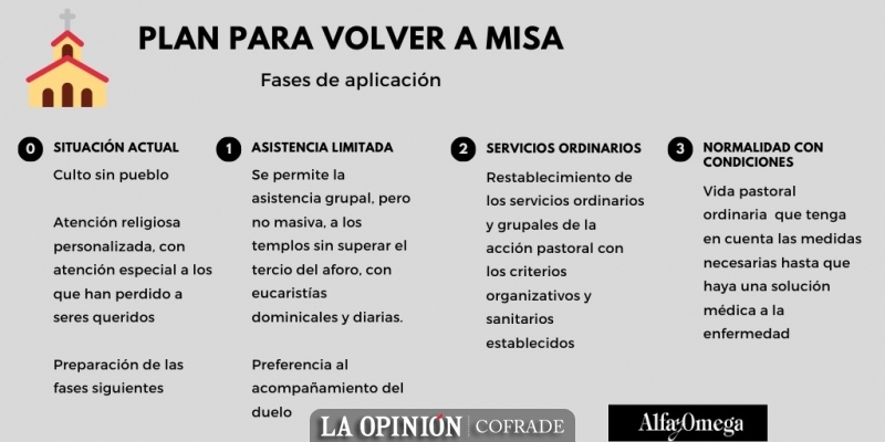 Fase 1: Se permite la asistencia grupal, pero no masiva, a los templos sin superar el tercio del aforo, con eucaristías dominicales y diarias. Quizá con preferencia al acompañamiento de las familias en su duelo.