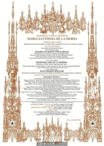 El día 8 día en que la Iglesia celebra la fiesta de la Natividad de la Virgen y en Cabra es el Día de la Sierra, la función principal será a las 10:30h presidiendo el párroco de Santo Domingo y Remedios, Francisco J. Delgado Alonso. El Centro Filarmónico Egabrense bajo la dirección de José Luis Arroyo Casas cantará la misa, acompañando al órgano Manuel Molina Carrillo.