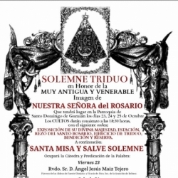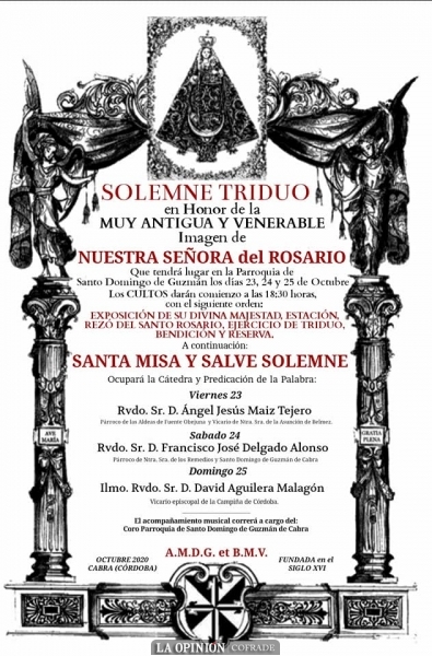 Los cultos tendrán darán comienzo cada día a las 18:30h con exposición del Santísimo, rezo del Santo Rosario, ejercicio del triduo, bendición y reserva. A continuación será la misa, que será celebrada por los sacerdotes Ángel Maíz Tejero - párroco de las aldeas de Fuente Obejuna y vicario parroquial de Belmez- el día 23; Francisco J. Delgado Alonso - párroco de Santo Domingo y los Remedios de Cabra - el día 23 y David Aguilera Malagón - vicario episcopal de la Campiña - el día 25. El coro de la Parroquia de Santo Domingo se encargará de la parte musical.