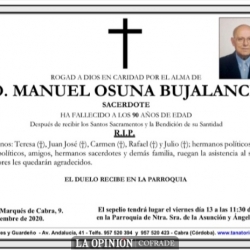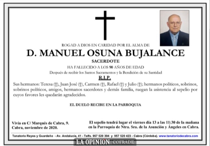 Manuel Osuna falleció en Córdoba el 12 de noviembre de 2020, a los 90 años de edad. La misa exequial tendrá lugar mañana viernes, 13 de noviembre, a las 11:30 horas, en la parroquia Asunción y Ángeles de Cabra.