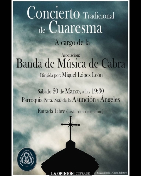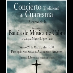- La Banda de Música de Cabra realiza su tradicional Concierto de Cuaresma que tendrá lugar el sábado 20 de marzo a las 19:30h en la parroquia de la Asunción y Ángeles, concierto que dirige el maestro Miguel López Léon.
