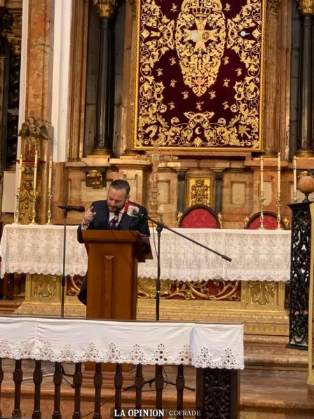 Finalizó con una letanía dolorosa de su original que dedicó a las advocaciones marianas de nuestra ciudad pidiendo a la Virgen «que es solo una [...] que veles por todos nosotros, que seas fuego eterno de nuestro amor, que nos dejes ser tus pies, ser movimiento inventado, que sobre nuestras alpargatas se hará grande y sobre mi cerviz humilde».