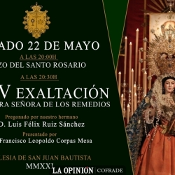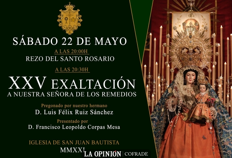 Tras la veneración de la imagen de Ntra. Sra. de los Remedios y su Niño Jesús el pasado fin de semana, esta semana hay dos importantes convocatorias. Por un lado el jueves 20 de mayo tiene lugar una ofrenda floral a las 20:30h y por otro el sábado 22 de mayo a la misma hora va a tener lugar la exaltación a la Virgen de los Remedios que llega a su vigésimo quinta edición y que en este año será ofrecida a la Santísima Virgen por el cofrade Luis Félix Ruíz Sánchez, pregonero de la Semana Santa de Cabra 2018. Será presentado por el presidente de la Agrupación de Cofradías y también exaltador en 2018, Francisco L. Corpas Mesa.