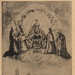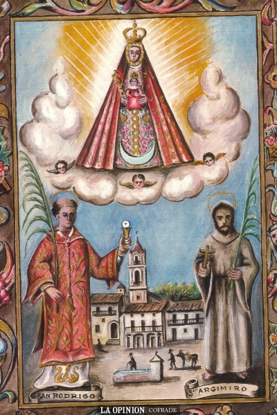 También en un grabado atribuido a Alfonso Santiago aparece la Virgen de la Sierra con San Rodrigo y San Argimiro, lo mismo que en los cuadros que se han situado en la nave de las antiguas capillas de la parroquia de la Asunción a los lados de una de las representaciones iconográficas más antiguas de la Virgen de la Sierra.