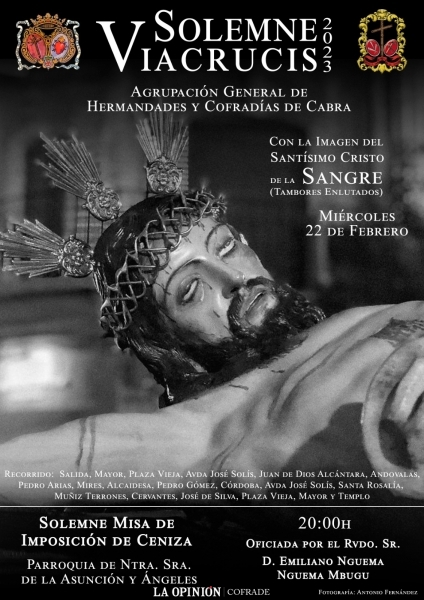 El Miércoles de Ceniza está cada vez más cerca y la Agrupación General de Hermandades y Cofradías de Cabra ha preparado los actos tradicionales de esa jornada, como son la misa e imposición de ceniza, que tendrá lugar en la parroquia de la Asunción y Ángeles, el 22 de febrero a las 20:00h. A continuación tendrá lugar el Vía Crucis Oficial de Cabra, organizado por esa institución, que se inicia en dicho templo.