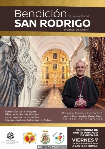La nueva imagen de San Rodrigo será bendecida por el obispo de Córdoba, monseñor Jesús Fernández, este viernes, 7 de noviembre, a las 19:00 horas. Acompañarán al prelado el nuevo Delegado de Hermandades, José Juan Jiménez Güeto y el consiliario de la Agrupación de Cabra y párroco de Santo Domingo de Guzmán, Francisco José Delgado.