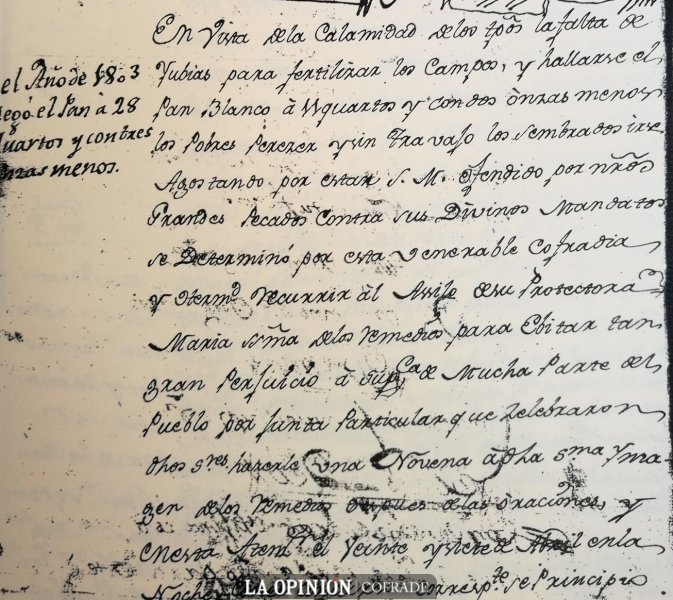 En vista de la calamidad de los tiempos, la falta de lluvias para fertilizar los campos y hallarse el pan blanco a 11 cuartos y con 2 onzas menos, los pobres perecen y sin trabajo los sembrados irse agostando por estar Su Magestad ofendido por nuestros grandes pecados contra sus Divinos Mandatos.