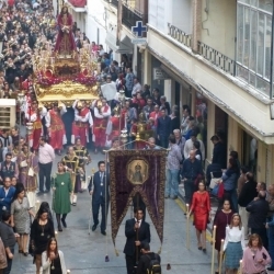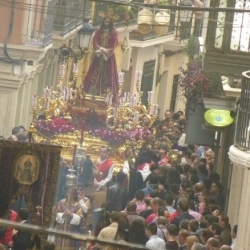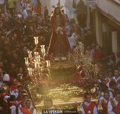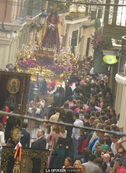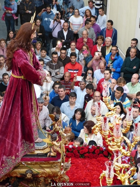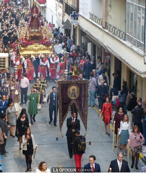 Una procesión que no solo fue extraordinaria por la fecha, la música o la vestimenta que llevaba la imagen, que también, pues pudimos ver la túnica de terciopelo carmesí bordada en hilo de oro, de claro sabor decimonónico. El recorrido fue otro de los alicientes de la tarde en la que el tiempo permitió que todo se desarrollara sin problema. Con toda solemnidad, la imagen del Preso, sobre su clásica peana de carrete, se erguía ofreciendo su mirada dulce y serena sobre un manto de rosas rojas, claveles y algún lirio morado. Llevado por sus "judíos", manteniendo la esencia tradicional de una corporación señera de la Semana Santa de Cabra, no le faltó la escolta de los romanos de las Angustias y del Imperio Romano que quisieron sumarse al escuadrón de lanceros venidos de Campillos, que abrían el cortejo con un grupo de tambores de la Cofradía de las Lágrimas de aquella localidad malagueña.