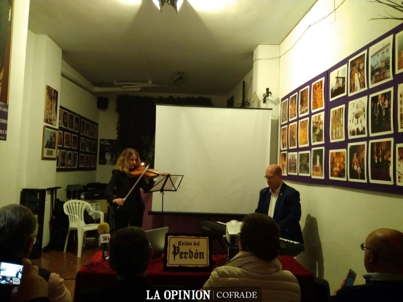 La charla estuvo ilustrada con el dúo musical formado por Alfonso Fernández Pérez-Aranda, al piano, y Esther Jiménez Prados, que hicieron una amena introducción musical al acto, interpretando "La Saeta", y pusieron el broche final con una versión magnífica de "Cristo del Perdón".