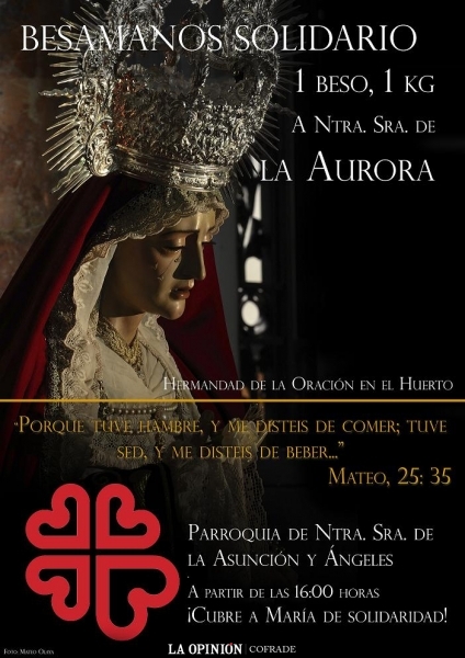 La Real Hermandad de Nuestro Padre Jesús de las Penas y de la Oración en el Huerto, convoca a sus hermanos y devotos a los Solemnes Cultos a celebrar el próximo sábado, 1 de noviembre, en honor de la imagen mariana de la Hermandad, Nuestra Señora de la Aurora. Durante dicha jornada, y a partir de las 16:00 horas, la imagen de la Santísima Virgen se encontrará en devoto besamanos en la sede canónica de la corporación del Domingo de Ramos egabrense, la Parroquia de Nuestra Señora de la Asunción y Ángeles. Éste besamanos, se caracteriza por la singularidad de que, desde el pasado año, se trata de un acto de veneración y solidaridad. Bajo la campaña "1 beso, 1 kg", la Junta de Gobierno que preside José Alberto Pérez-Aranda Lama, invita a los hermanos, devotos y egabrenses en general a acudir al besamanos con alimentos no perecederos, que la Hermandad entregará al finalizar el besamanos a Cáritas de la Asunción. Dicho organismo, ha comunicado que es aceite lo que primordialmente se necesita en Cáritas.